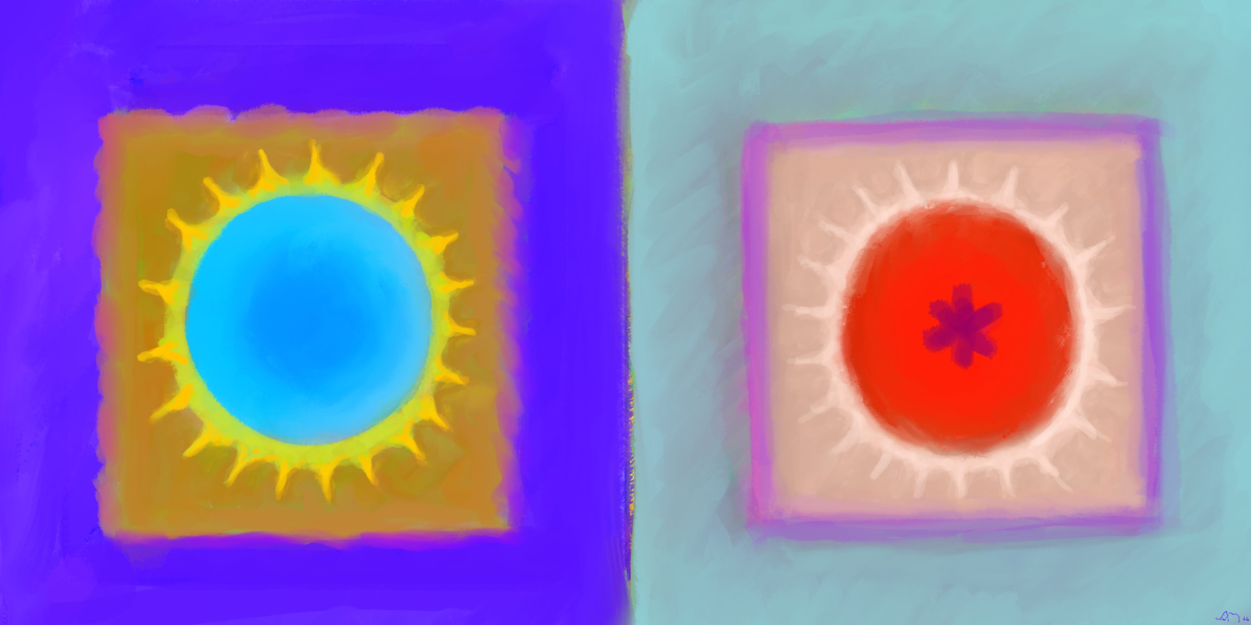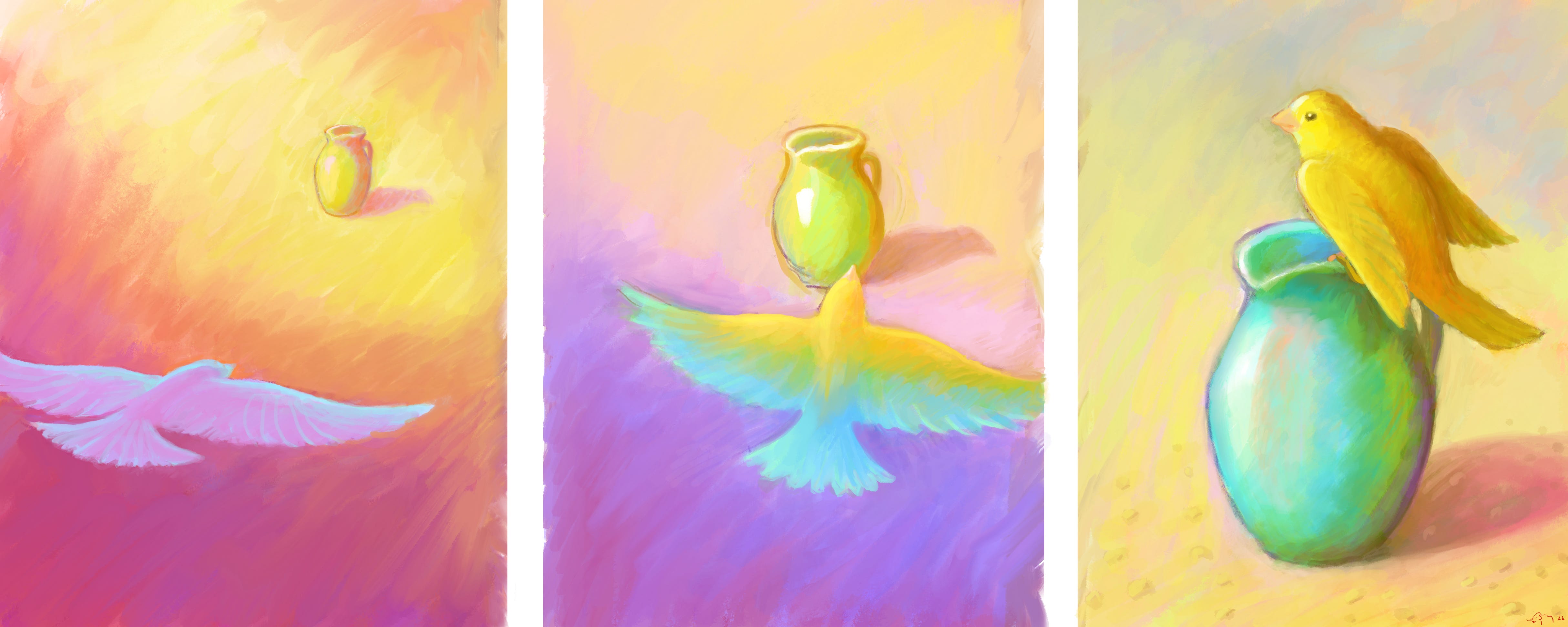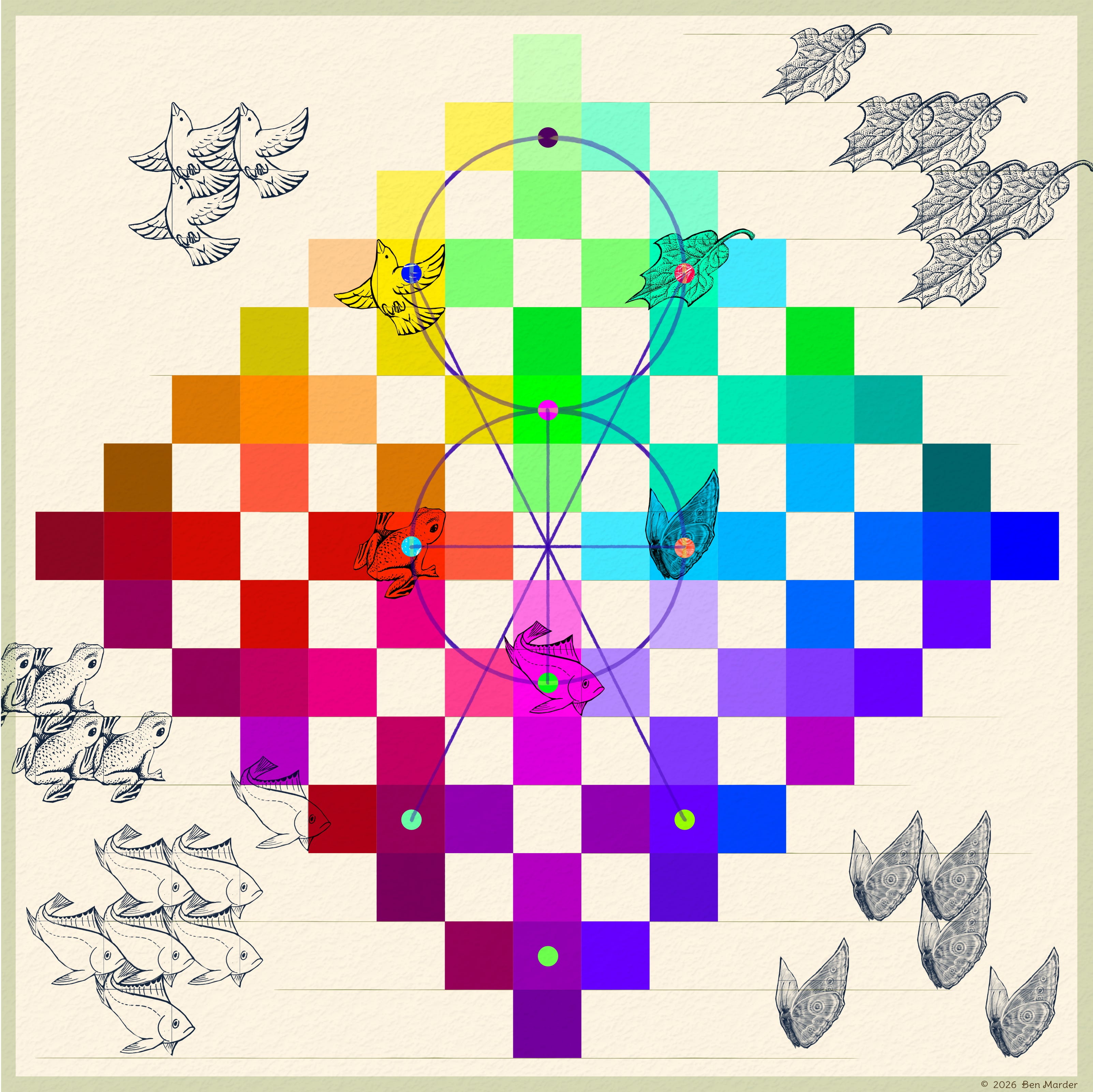 I am expressing color in terms of pigment; however, in this article, I am using the computer to help me arrange colors. I have lots of experience mixing paint but found it easier to play with colors digitally for this project. There is also the reality of photographing physical artwork and how colors translate differently in photographs. I hate that I have to say this, but there is no use of A.I. in any part of my artwork.