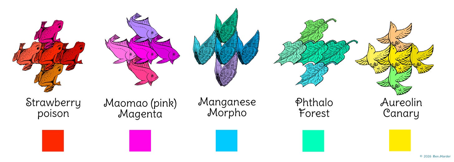 Let me also talk about Manganese Morpho (blue) and Strawberry Poison (red) as part of the Five Primary Colors. Manganese Morpho could be the color of the sky on a crystal clear day. Look at the sky and see the spectrum there. It is warm, light, and clear, as well as deep further above the horizon. It recedes into space, whereas Strawberry Poison comes forward. Strawberry Poison has a notable punctuation in its surroundings. Think of poppy flowers in a field, or how the Strawberry Poison Dart frog announces its toxicity. Both Manganese Morpho and Strawberry Poison have the capacity to become deep and saturated, as well as bright and illuminated when thinned out. Mind you, I am thinking in terms of pigment now. I have not encountered a true Strawberry Poison pigment, but nature always holds the key to what is possible.