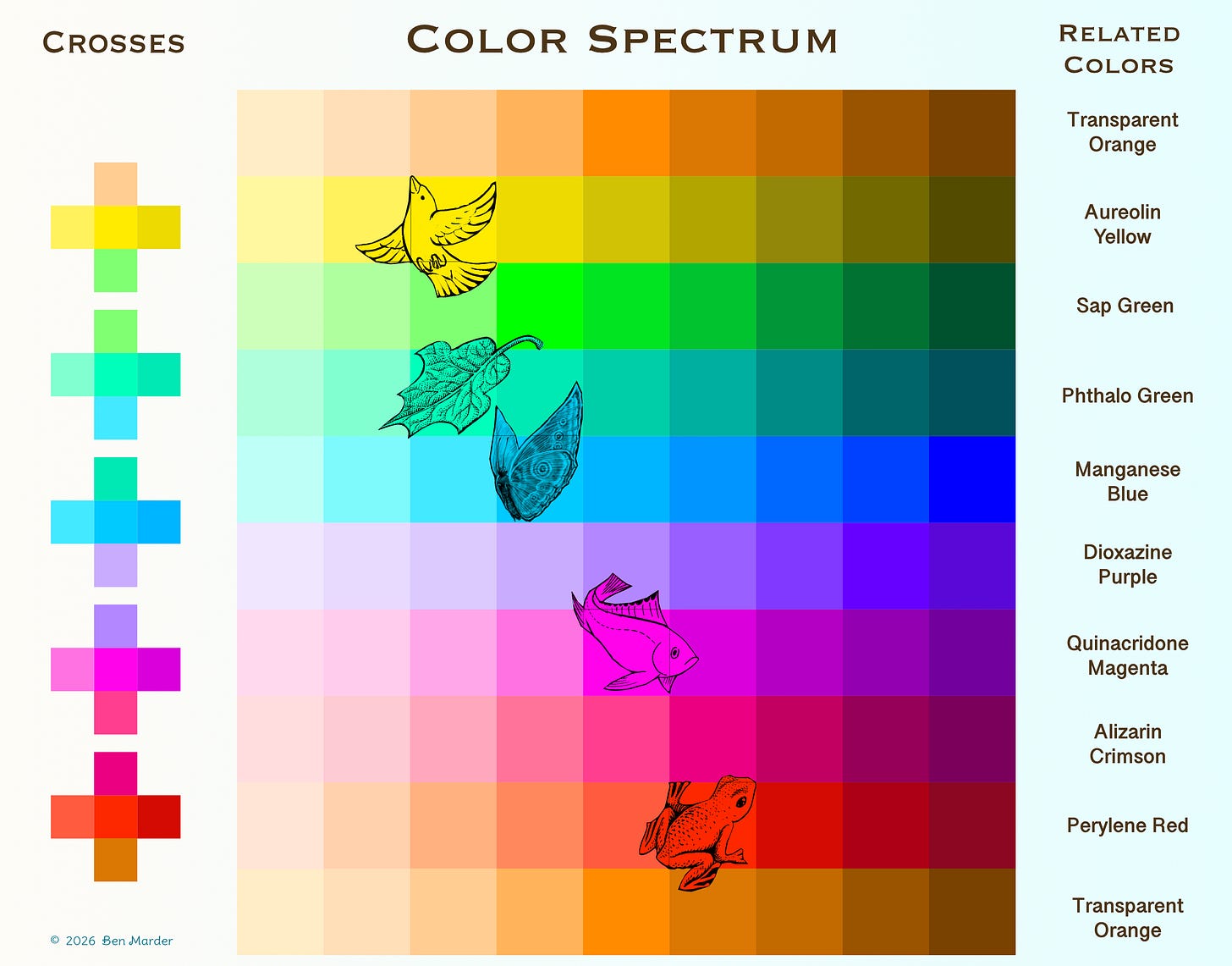 Additionally, colors don’t look the same across all mediums. This is another reason why I gave them unique names in this article, because I don’t want to be responsible for saying exactly what they are, but rather to convey a sense of what they look like. I did not use any mathematical formulas when creating the swatches of color here; I simply hand-picked each color based on its neighbor. The visual below illustrates how the crosses on the chart were derived. I also feel, in retrospect, that the spectrums I came up with do, in some ways, relate to natural pigments, so I provided pigment names to place them in a broader context. I chose pigments that all demonstrate transparent color qualities, meaning they range from light to dark.