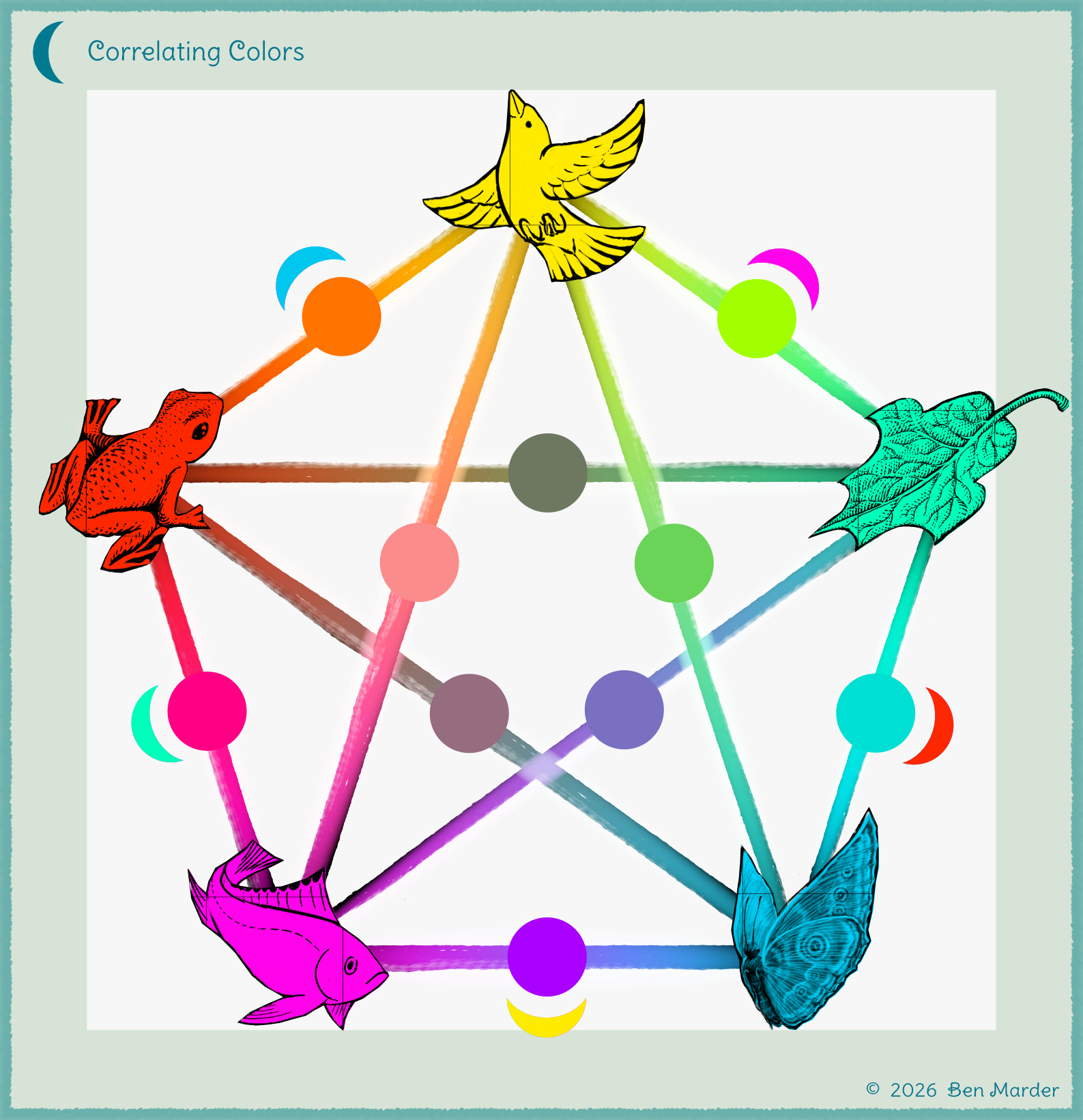 I have related the primary colors to animals and plants because, when we see those species, we understand how marvelous their colors are. Not just how they are, but how diverse they appear and what the light of their bodies does as our sight reaches them. I have given the primary colors names respectively and have arranged the spectrum with the intention of creating meaning between colors so that there is a visual representation of the colors I am perceiving. The five primary colors have a purposeful placement and are identified not only by color but by their arrangement in space.
